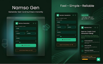 Namso Gen Extension è un add-on gratuito per Chrome, progettato per sviluppatori, ingegneri QA e ricercatori di sicurezza. Permette di generare dati di test Luhn-validi in modo rapido ed efficace, senza la necessità di cambiare schede o utilizzare generatori web ingombranti. Grazie a un'interfaccia utente a sovrapposizione istantanea, gli utenti possono generare e copiare dettagli di test validi, come numeri di carta, CVV e date di scadenza, direttamente dalla loro scheda attiva.